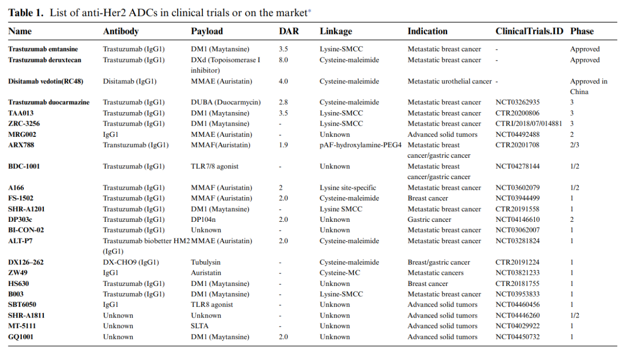 HER靶向ADC正在成为HER阳性癌症患者非常有希望的治疗方法,三种抗HER2 ADC(T-DM1、DS-8201a和RC48)被批准用于HER2阳性癌症,11种HER靶向ADC目前正在临床试验中。