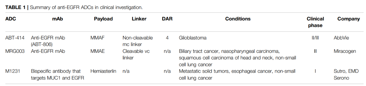 EGFR在多种肿瘤类型中扩增或过表达,已被证实为重要的肿瘤靶点。然而,目前还没有靶向EGFR的ADC被批准用于癌症的治疗。目前,有三种针对EGFR的ADC正在进行临床研究,包括depatuxizumabmafodotin(ABT-414)、MRG003和M1231。ABT-414是迄今为止最领先的EGFR靶向ADC,已进入III期临床试验。