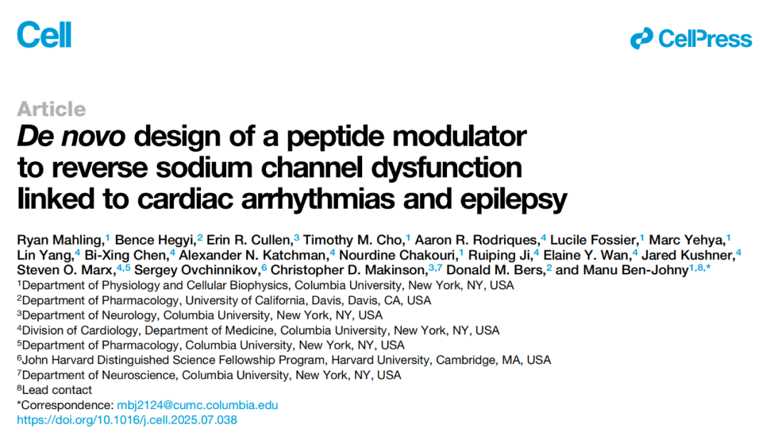 2025 年 8 月 18 日,哥伦比亚大学的研究人员在国际顶尖学术期刊 Cell 上发表了题为:De novo design of a peptide modulator to reverse sodium channel dysfunction linked to cardiac arrhythmias and epilepsy 的研究论文。