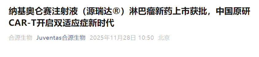 昨日,合源生物宣布,其自主研发的CAR-T细胞治疗产品纳基奥仑赛注射液(商品名:源瑞达®)新药上市获得中国国家药品监督管理局的批准,用于治疗经过二线及以上系统性治疗后复发或难治性大B细胞淋巴瘤(r/r LBCL)。
