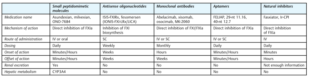 诱导功能性FXIa缺乏症的机制包括用反义寡核苷酸(ASO)抑制FXIa的生物合成,或使用小肽模拟分子、单抗、适配子或天然抑制剂直接抑制FXIa的信号通路(表1)。