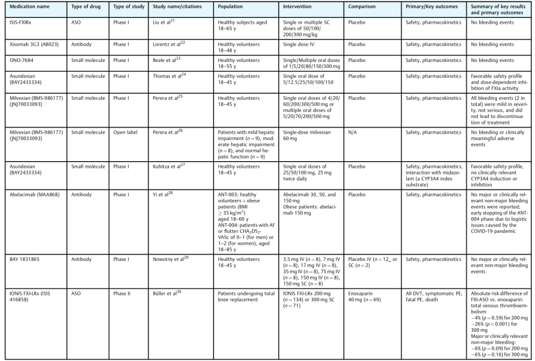 多个不同阶段的临床试验已经测试了FXIa抑制剂的安全性和有效性。大多数II期试验将单抗或小分子与低分子肝素(LMWH)依诺肝素或直接口服的FXa抑制剂apixaban进行比较(表2)。