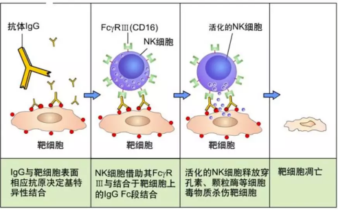 ADCC,抗体依赖的细胞介导的细胞毒性作用(Antibody-Dependent Cell-mediated Cytotoxicity ),是指抗体的Fab区结合病毒感染的细胞或肿瘤细胞的抗原表位,Fc段与杀伤细胞(NK细胞、巨噬细胞、中性粒细胞等)表面的FcR结合,介导杀伤细胞直接杀伤靶细胞。