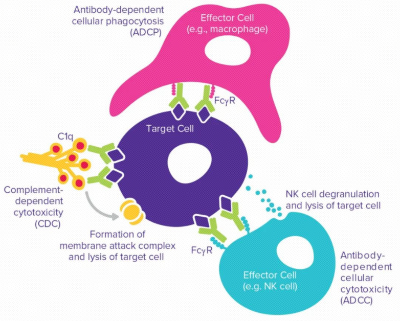 抗体由抗原结合域(Fab)和结晶区域(Fc)组成。抗体的Fab区用来识别抗原,包括游离的靶点和细胞表面受体,而Fc区通过结合各种FcγRs,发挥ADCC、ADCP、CDC等效应功能发挥效应功能。