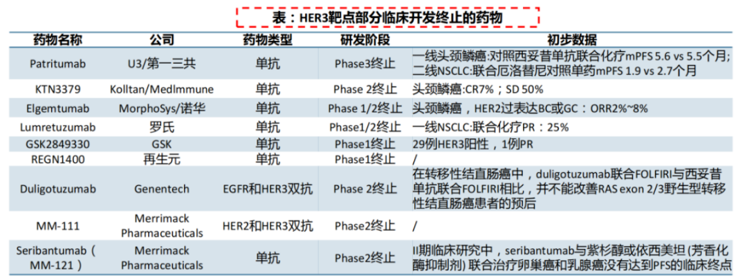 例如,第一三共的Patritumab、KTN3379、Elgemtumab和Lumretuzumab等HER3单抗,皆因疗效不佳或安全性问题被终止研究;EGFR/HER3双抗Duligotuzumab、HER2/HER3双抗MM-111的临床开发也未能成功。