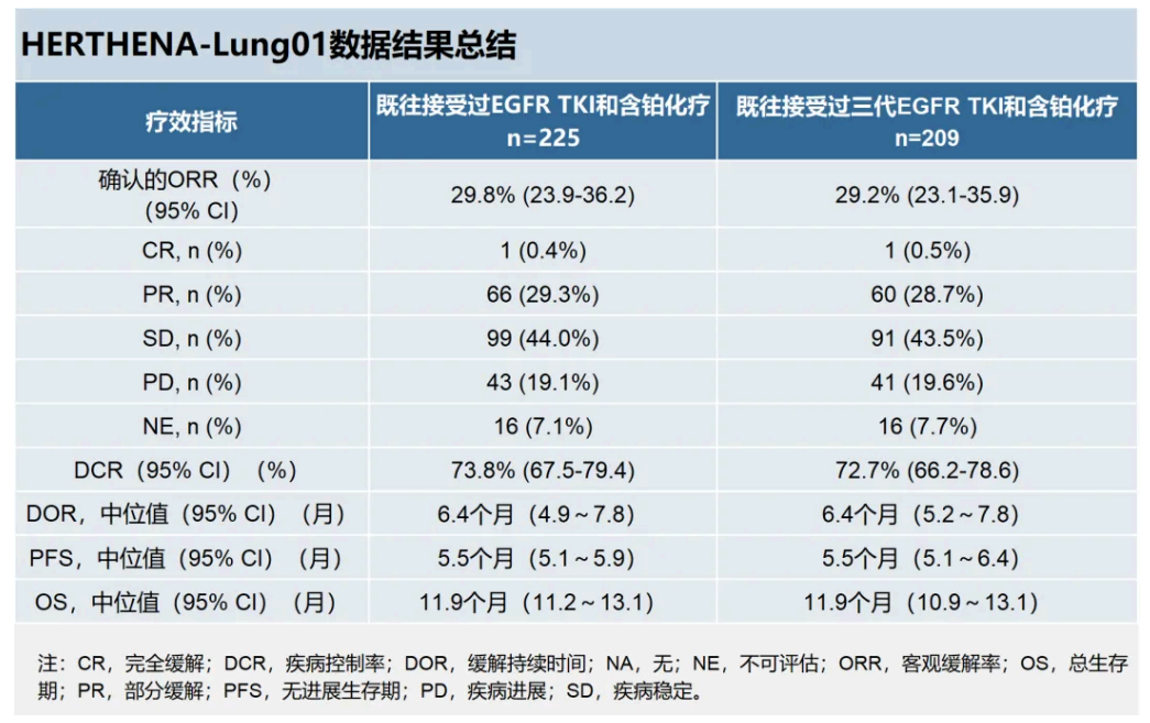 HER3-DXd的上市申请是基于关键II期临床试验HERTHENA-Lung01的研究结果:在225例接受HER3-DXd(5.6 mg/kg)治疗的EGFR-TKI和铂类化疗后进展的EGFR突变局部晚期或转移性NSCLC患者中,ORR为29.8%,中位PFS为5.5个月,中位OS为11.9个月。