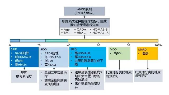 ANDIS 队列,是一个来自瑞典的 8980 例新诊断的成人糖尿病队列,根据诊断时的年龄、体重指数(BMI)、谷氨酸脱羧酶抗体(GADA,用于检测自身免疫)、糖化血红蛋白(HbA1c,用于检测血糖控制情况)、稳态模型 2-B(HOMA2-B,根据 C 肽和血糖水平评估β细胞功能)、HOMA2-IR(评估胰岛素敏感性)等不同,将糖尿病分为 5 类: