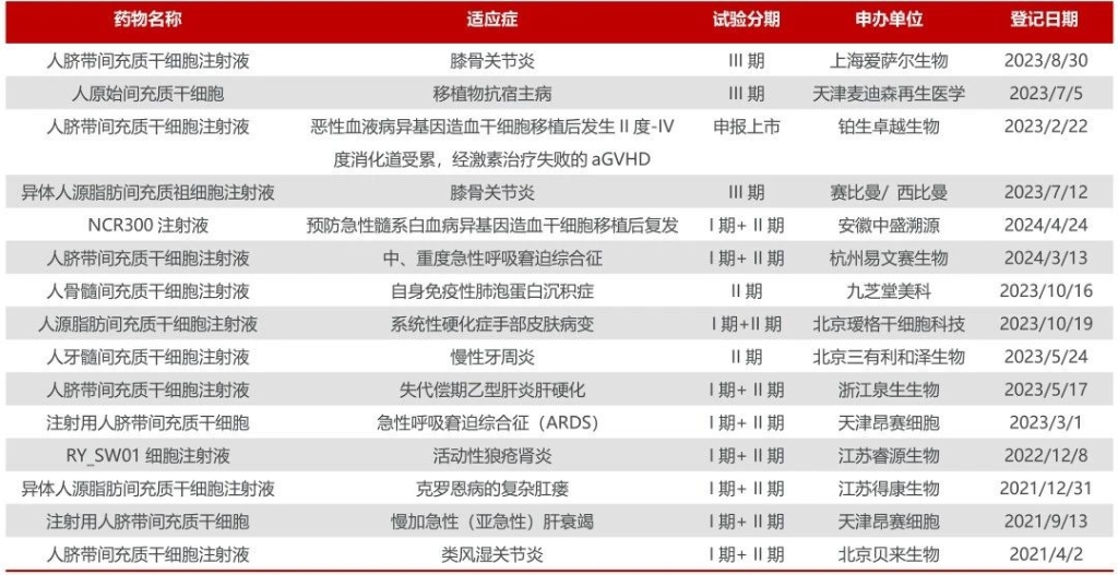 从2018年到2024年7月,国内干细胞新药 IND获批83个,进入临床60个。据不完全统计,国内干细胞创新药处于III期临床试验4项,II期临床试验11项。