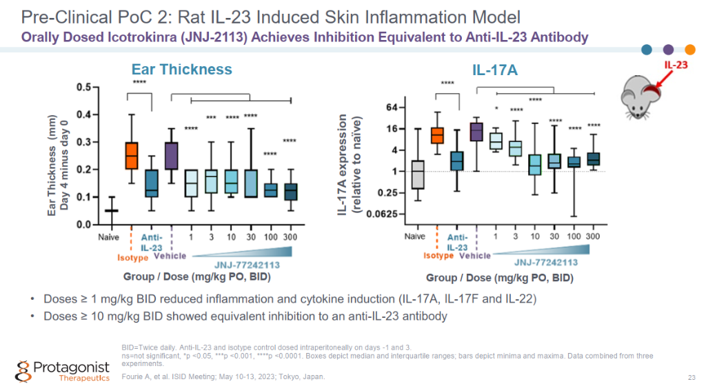 在大鼠IL-23诱导的皮肤炎症模型中,口服Icotrokinra (JNJ-2113)达到与抗IL-23抗体等效的抑制作用。