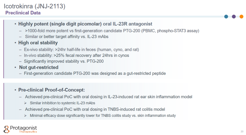 临床前,相比于第一代PTG-200,具有更高的活性,具有跟IL-23抗体相似的亲和力。稳定性更好,不受肠道局限。