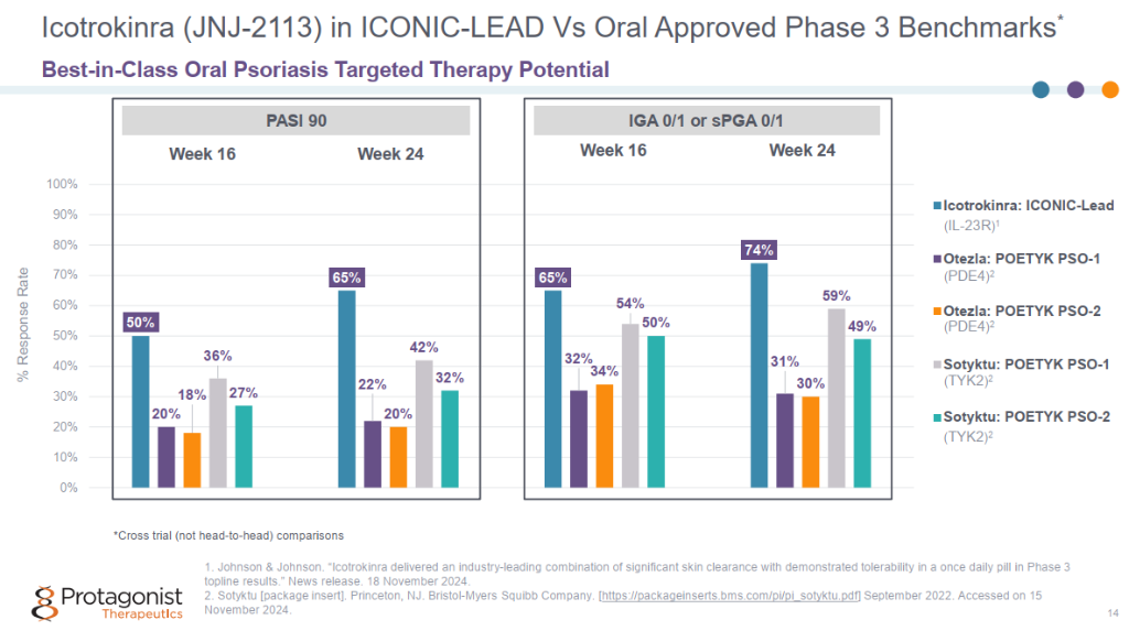 通过二期数据对比,Icotrokinra (JNJ-2113)具有最优的疗效数据,具有可比性的就是Tremfya (Guselkumab,古塞奇尤单抗是一种重组人源性 IgG1 单克隆抗体,针对 IL-23p19 亚基)和TYK2抑制剂TAK-279。