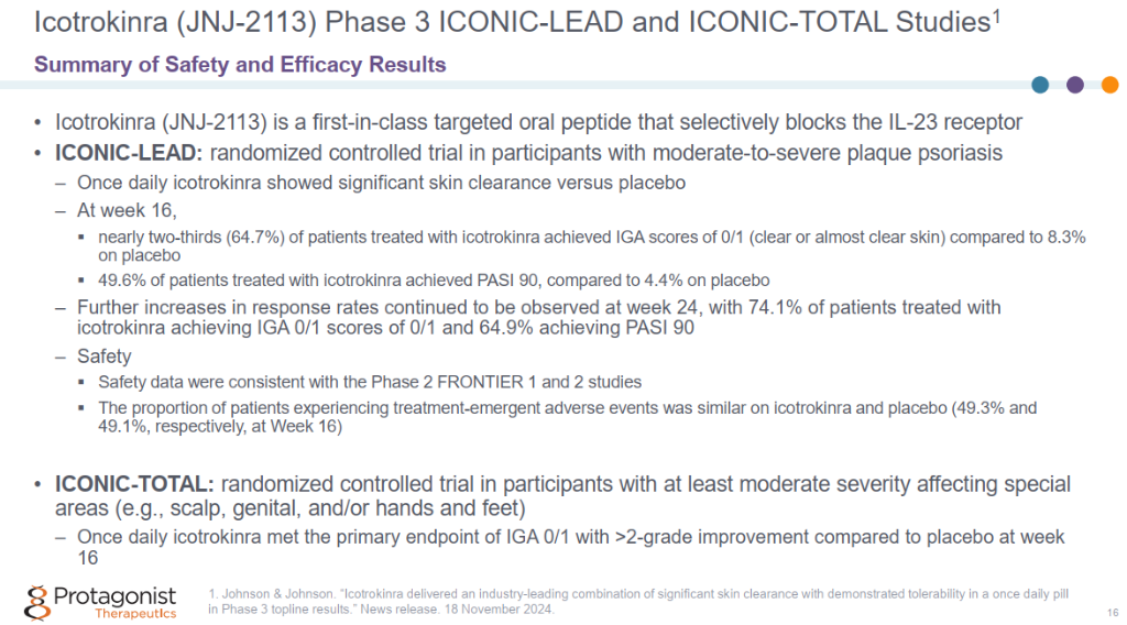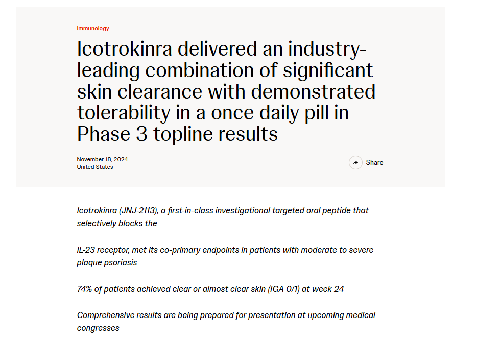 2024年11月18日,强生宣布ICONIC-LEAD 的积极顶线结果,这是一项关键的三期临床试验,研究对象为 icotrokinra (JNJ-2113),icotrokinra 是首个选择性阻断 IL-23 受体的靶向口服肽,针对患有中度至重度斑块状银屑病 (PsO) 的成人和 12 岁及以上的青少年。