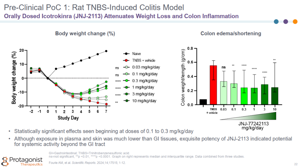 大鼠TNBS(三硝基苯磺酸)诱导结肠炎模型中,展现了良好的药效,减缓体重下降和结肠炎症。