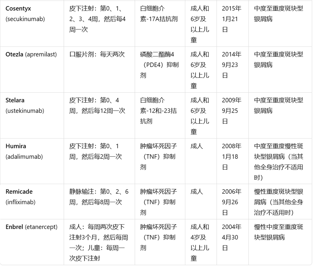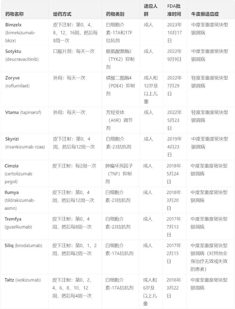 斑块型银屑病的最新局部治疗方法是磷酸二酯酶4(PDE4)抑制剂罗氟司特 (Zoryve)和芳烃受体(AhR)调节剂塔皮那洛夫(Vtama)。Spevigo(spesolimab-sbzo)是一种白介素36受体拮抗剂,于2022年9月获批,专门用于治疗泛发性脓疱性银屑病。FDA近年批准的银屑病疗法汇总见表1。
