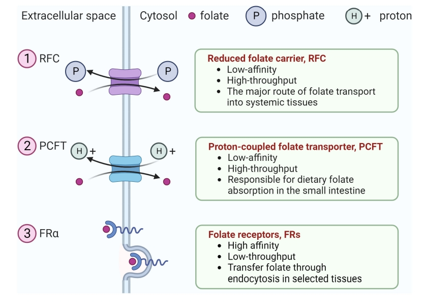 人体不能合成叶酸,这是真核细胞增殖和分化所必需的维生素,必须从饮食来源获得叶酸。细胞外叶酸的摄取主要通过三种类型的叶酸转运蛋白实现,包括还原叶酸载体(RFC)、质子偶联叶酸转运蛋白(PCFT)和叶酸受体(FR)。普遍表达的RFC是叶酸转运进入系统组织的主要途径,而PCFT是一种质子偶联转运体,负责小肠中膳食叶酸的吸收。RFC和PCFT都是低亲和力、高通量的转运蛋白。相反,FR是高亲和力、低通量的转运蛋白,通过在选定组织中的内吞作用转移叶酸。