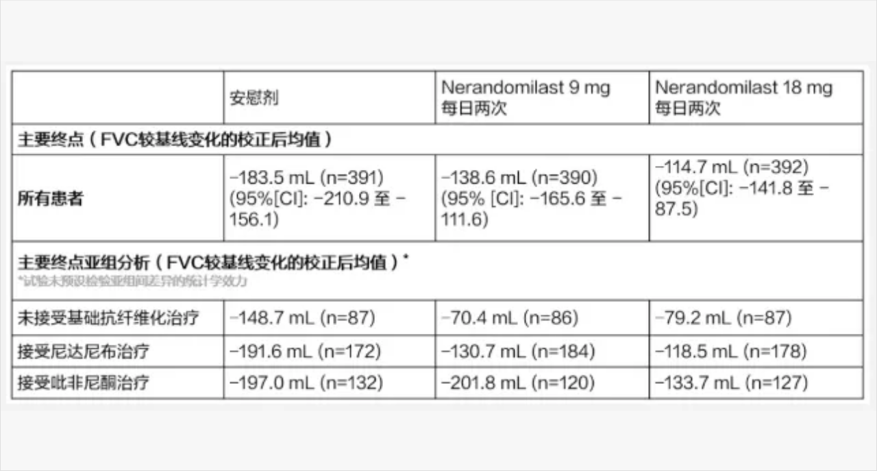 FIBRONEER™-IPF 是一项双盲、随机、安慰剂对照试验,旨在评估至少接受 52 周治疗,那米司特对 IPF 患者的疗效和安全性。主要终点是第 52 周时用力肺活量(FVC,mL)较基线的绝对变化。