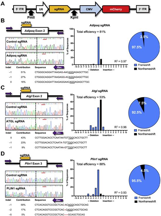 用sgRNA转染脂肪细胞前体细胞主要导致靶基因的移码突变,图片来自Journal of Biological Chemistry, 2021, doi:10.1016/j.jbc.2021.101402。